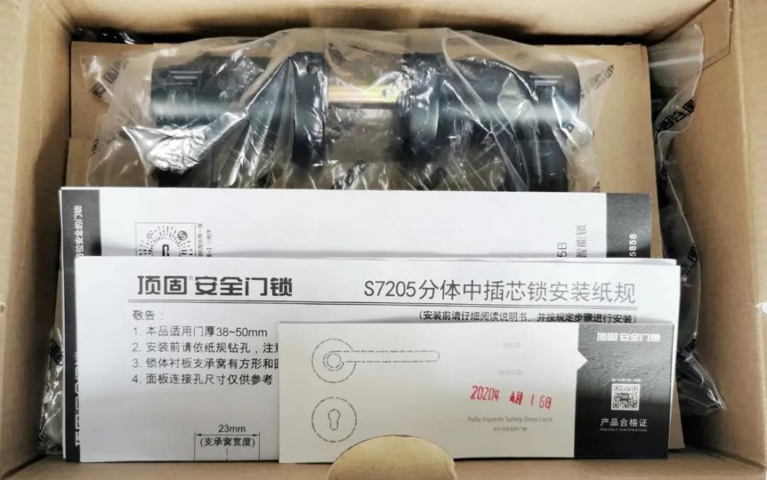 打开摇盖式的外包装盒,第一层放置的便是内外执手盖组件、安装说明书、分体中插芯锁安装纸规以及书签样式的产品合格证。