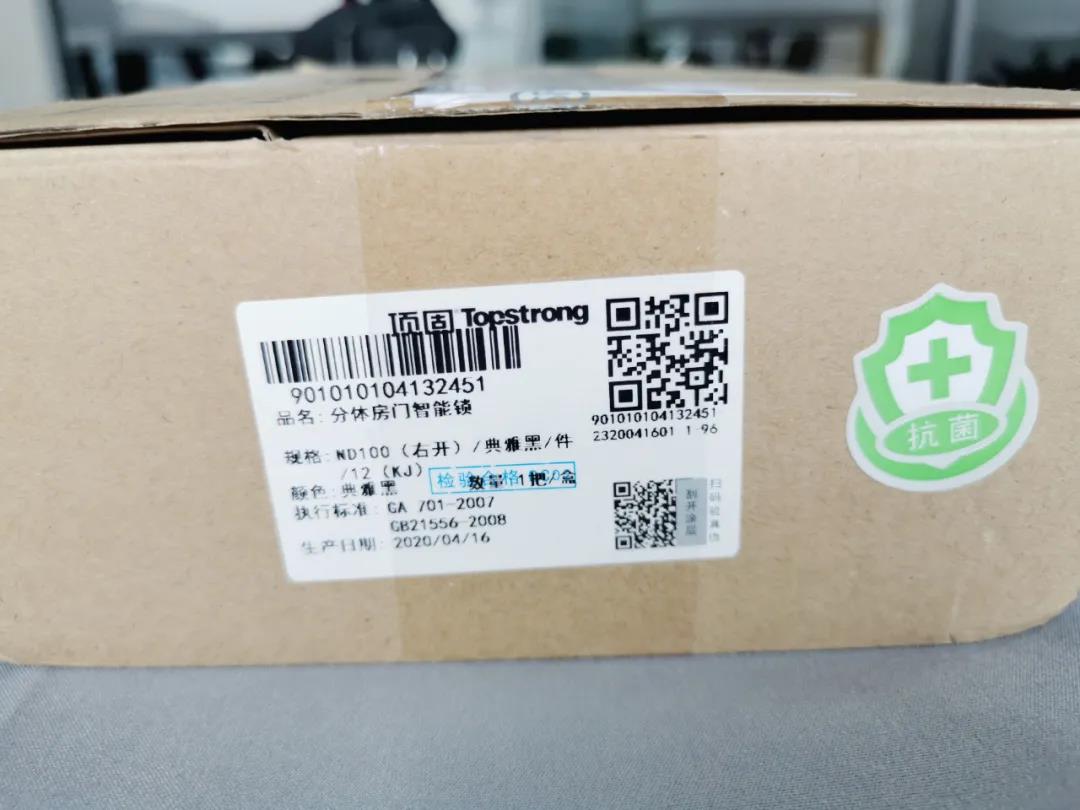 外包装上的产品标签,详细标注了锁具名称、规格(开门方式)、颜色以及生产日期。标签上另附有防伪二维码,刮开涂层,就可以检验产品的真伪。此外,绿色的抗菌标签也体现了顶固安全门锁对顾客的用心。