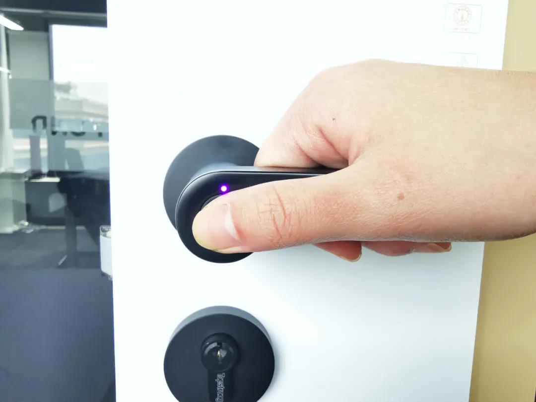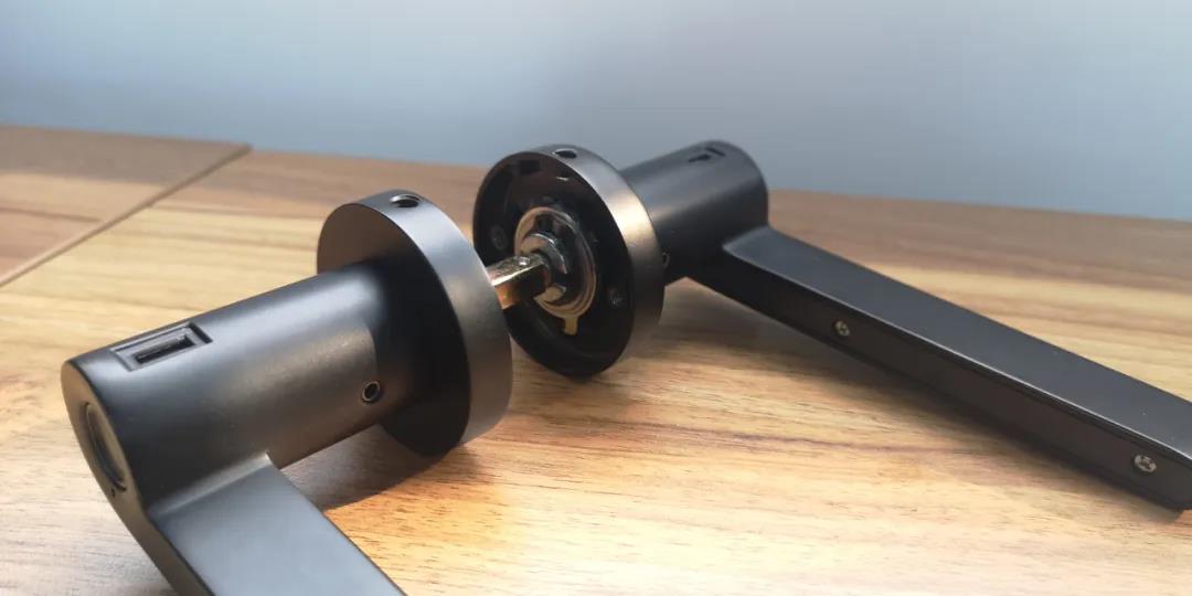 ND100的内外执手及其组件,均为黑色磨砂质感,手感温和,没有冰冷的刺激感。指纹头设置在执手前部,手握执手即可指纹解锁,指纹头采用的是半导体指纹传感器,真正做到流畅开启。
