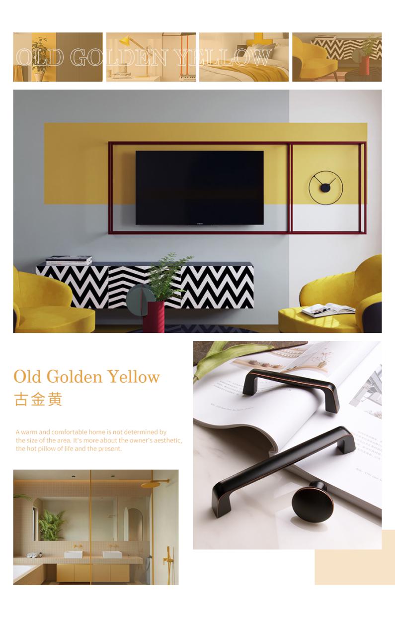 古金黄明亮但不过分艳丽,考虑将墙面涂黄,能让空间有一种洒满阳光的感觉,同时也可以为采光不佳的卫浴空间增添了一份光线感。另外选择一两件黑色小拉手单品装饰,看似漫不经心,实则内涵丰富且低调。