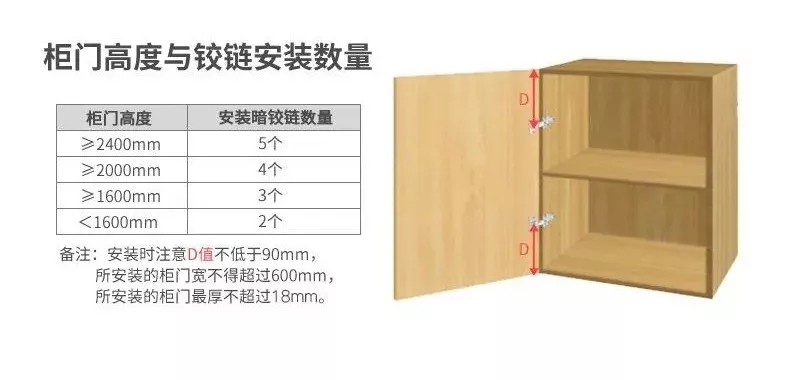 确定了选购哪种类型的铰链,第二步便是数量问题啦!适中的铰链数量可以延长柜门的使用寿命和使用的流畅性,参照下表标准,让你不多买也不买漏。