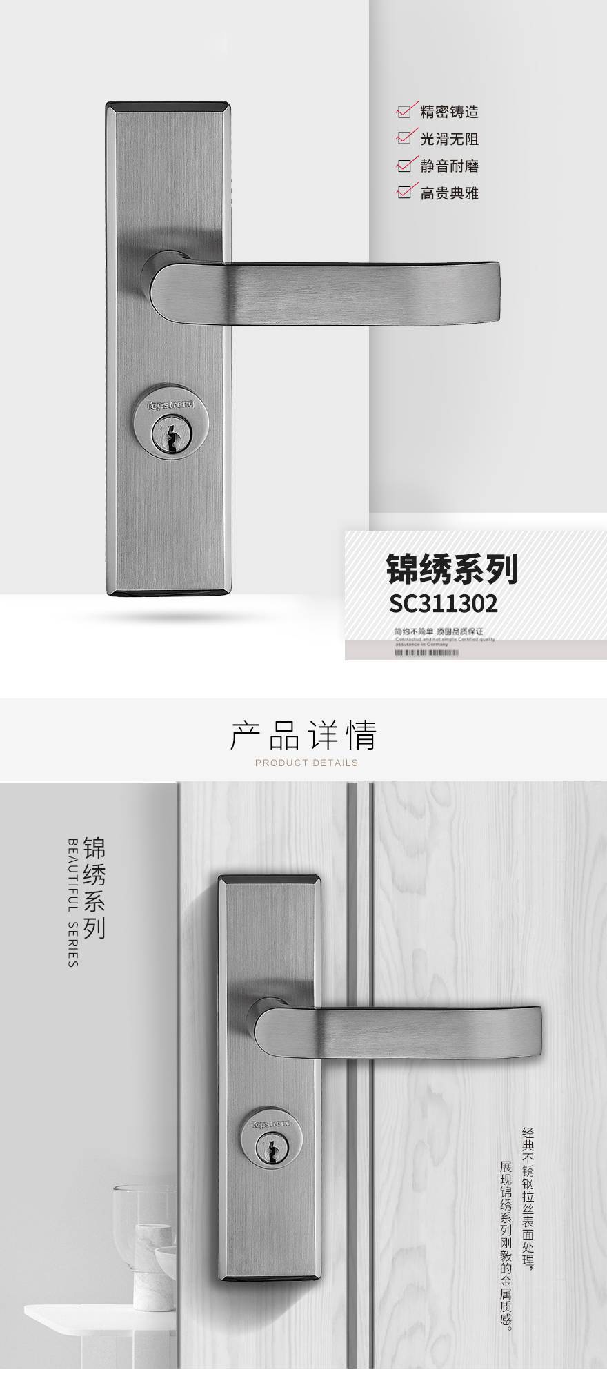 全系列均配置顶固三叉静音锁体,利用金属三叉斜舌减震消音,关门顺畅静音。