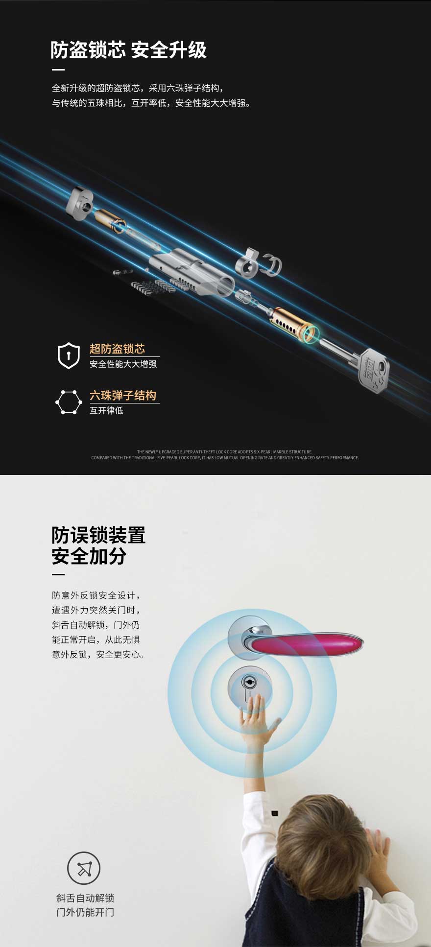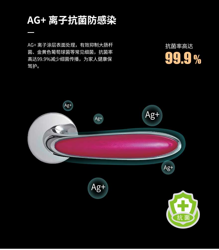 采用了20°小角度开启、专利圆钥匙锁芯、Ag+离子抗菌技术、防意外反锁、防夹防撞防盗、静音、快速逃生等安全设计,解决了传统门锁存在的多种安全隐患,全方位守护家人的安全,让家人轻松享受安全、便捷、健康、舒适的家居生活。