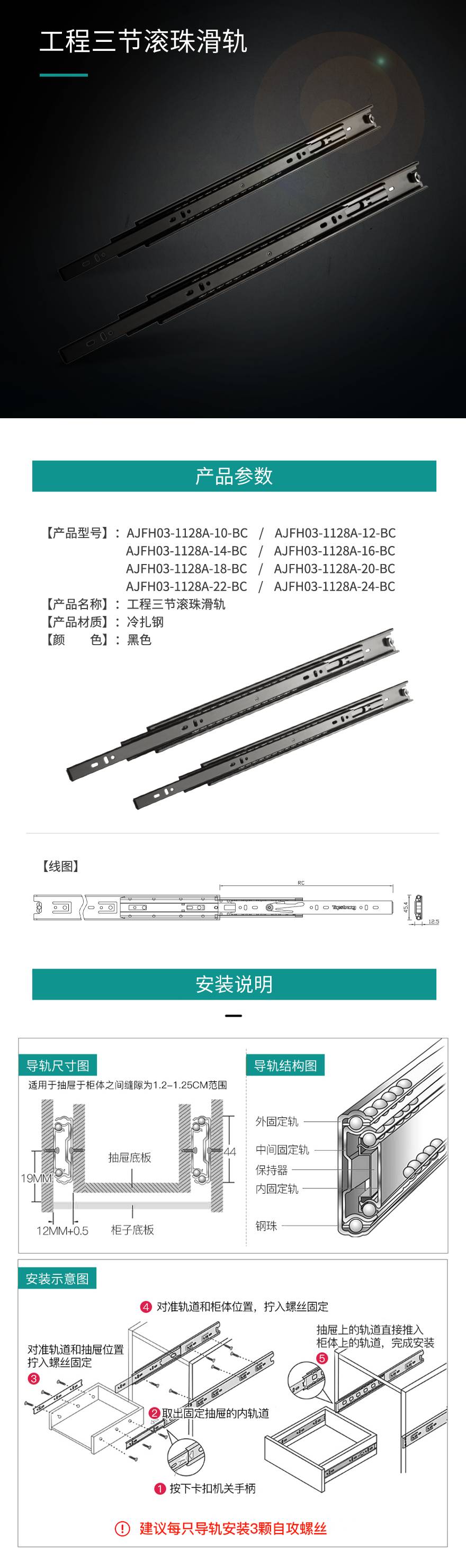 工程三节滚珠滑轨AJFH03-1128A