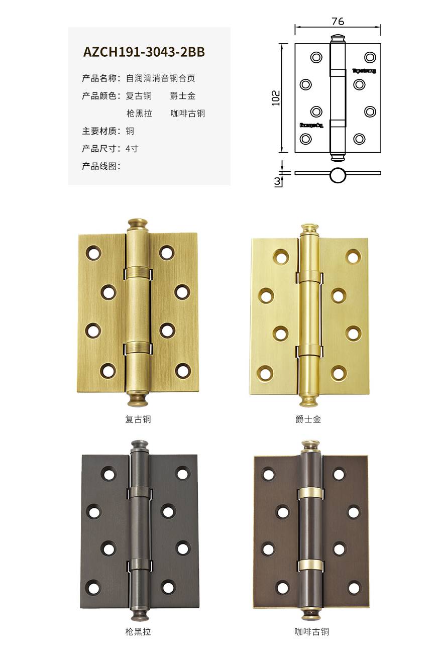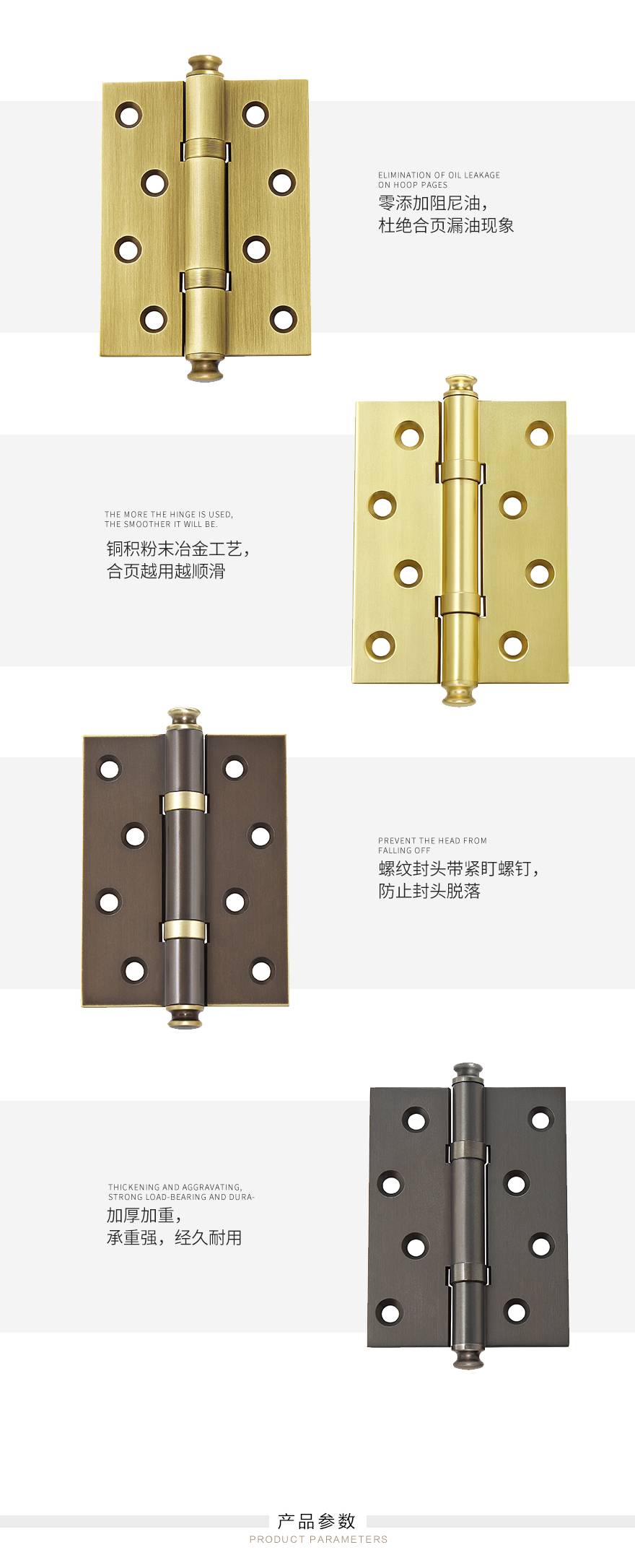 无油自润滑合页,解决“漏油”问题。真实铜材,高性价比,零添加阻尼油,杜绝合页漏油现像