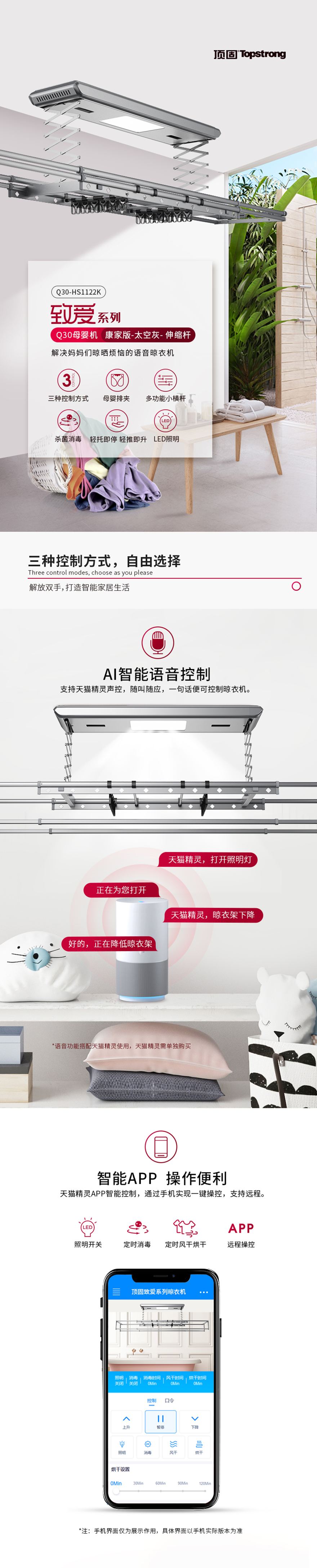 解决妈妈们晾晒烦恼的语音晾衣机,三种控制方式,自由选择,AI智能语音控制,支持天猫精灵声控,特色母婴夹,分区晾晒更洁净